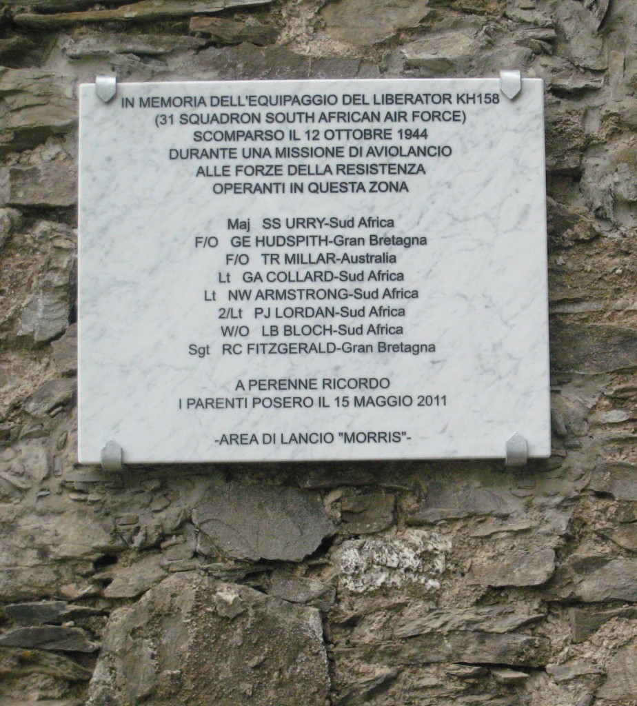 On Sunday 15th May a memorial plaque for the 12th October 1944 missing in action crew of Liberator KH158 of 31 Squadron SAAF was unveiled, in a ceremony high in the Ligurian part of the Apennine mountains, ENE of Genoa, Italy. The plaque is in place on an old “round house” wall in the grounds of a 1944 partisan meeting house, Faggio Rotondo. This is in the vicinity the 1944 partisan supply drop zone area code “Morris ” and near a regular mountain hiking trail.